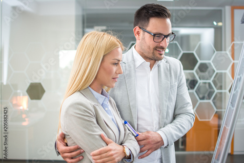 © Bojan, Fototapeta premium Businessman hugging attractive new female colleague while looking together at board in modern office