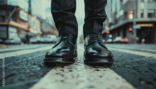 Fototapeta premium businessman in black leather shoes standing at a crossroads decides which way...