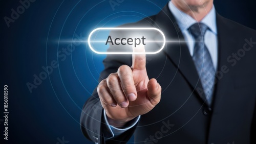 © TechVerse, Fototapeta premium Businessman in suit interacting with virtual accept button on blue background