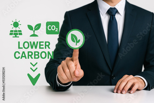 Fototapeta premium Businessman in suit points at green leaf icon, promoting lower carbon, renewable energy, and eco friendly solutions