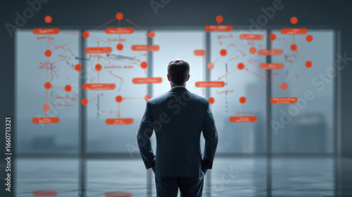 Fototapeta premium Businessman in suit stands in front of large glass window, analyzing complex data visualizations and flowcharts. atmosphere conveys sense of focus and strategic planning