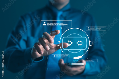 Fototapeta premium Businessman interacting with AI chatbot and virtual assistant interface for...