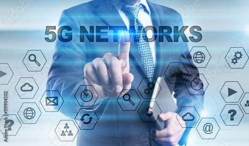 Fototapeta premium Businessman is pressing button on touch screen interface and selecting "5G...