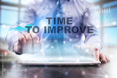 © WrightStudio, Fototapeta premium Businessman is using tablet computer, pressing button on touch screen and selecting "Time to improve".
