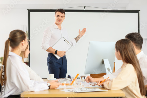 Obraz premium Businessman near projector screen during negotiations in conference hall