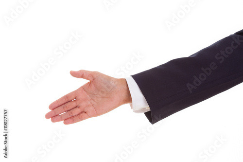 © japhoto, Obraz premium Businessman offering handshake to you on white background