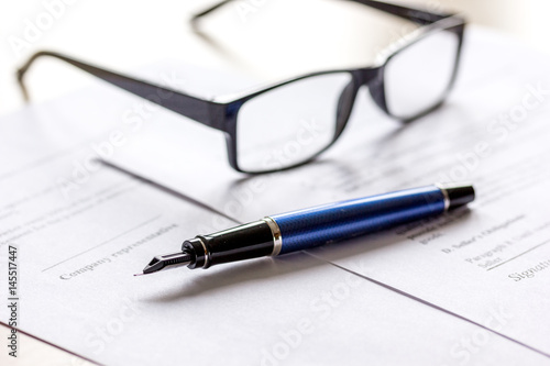 Fototapeta premium businessman office desk with contract for signig, glasses and pen