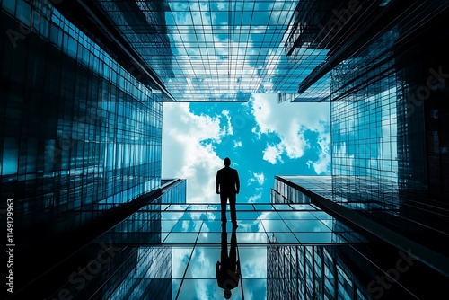 Obraz premium Businessman on a glass rooftop, looking at the sky. Concept of leadership, ambition, and success.