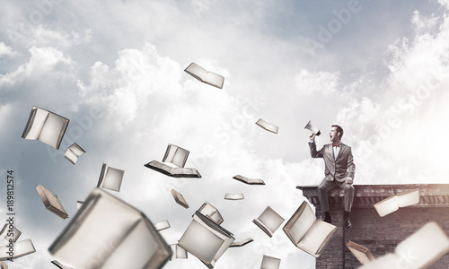 © adam121, Naklejka premium Businessman on building edge announcing something in loudspeaker