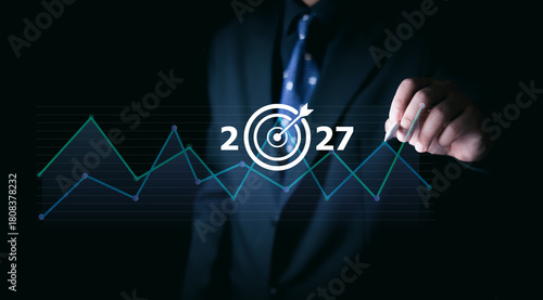 © PRIM, Fototapeta premium Businessman pointing at digital target icon with 2027 and rising line graph, symbolizing future strategy, financial growth, data analytics, corporate planning, and market performance trends.
