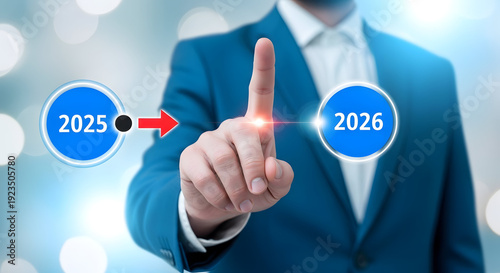 © Ms, Fototapeta premium Businessman pointing to a timeline from 2025 to 2026 in a futuristic setting with glowing background