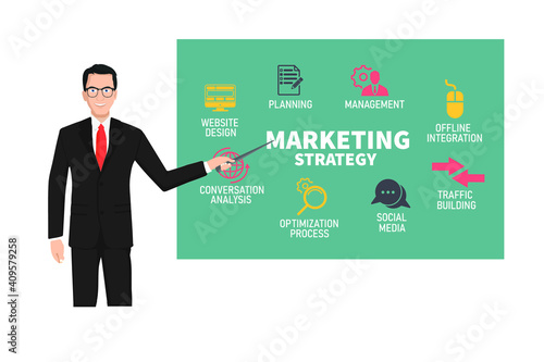 Fototapeta premium Businessman present a marketing strategy on board.Vector illustration.