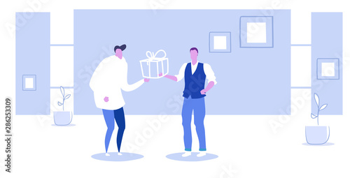 © mast3r, Obraz premium Businessman receiving wrapped gift box from male