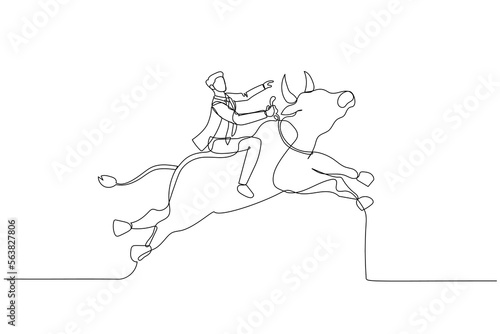 © rina, Fototapeta premium businessman riding a bull going up showing rising and bull market. One line art style