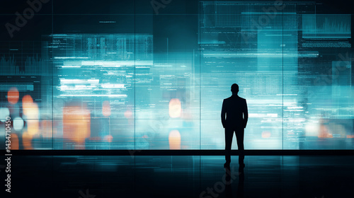 © Studio Side, Fototapeta premium Businessman Silhouette Analyzing Digital Financial Data