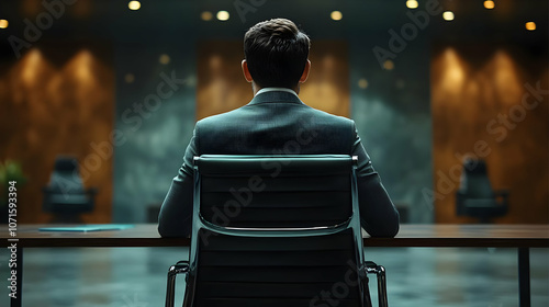 © Siasart Stock, Naklejka premium Businessman Sitting in Chair at a Conference Table - Realistic Image
