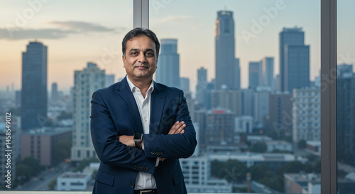 Fototapeta premium Businessman smiling confidently against a city skyline