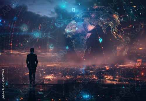 © SKIMP Art, Obraz premium Businessman standing in front of a glowing digital Earth with network connections and icons on a city background, a concept for global business technology or social connection Generative AI