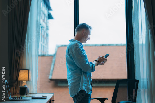 © Tj, Obraz premium Businessman standing next to a window in an office, using a smartphone while a desk with a laptop and coffee cup is visible in the foreground, creating a modern work atmosphere