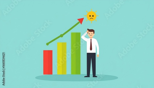 © pitchanat, Obraz premium Businessman standing next to colorful bar chart with an upward arrow and sad sun symbol representing growth challenges or financial concerns in a modern flat style