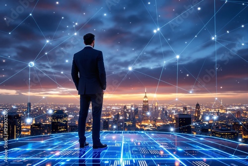 Obraz premium Businessman standing on futuristic digital platform overlooking city skyline...