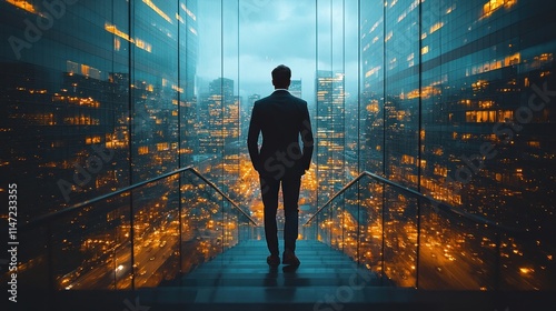 © RONNY, Obraz premium Businessman standing on stairs overlooking city at night.