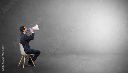Obraz premium Businessman staying in an empty grey dark room with stuffs on his lap