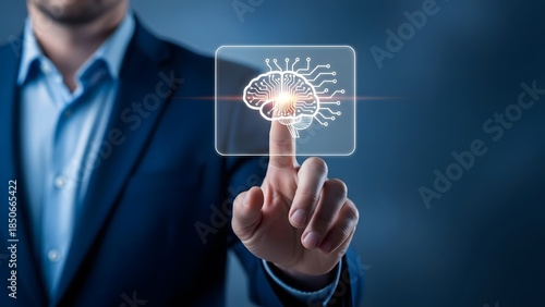 © Usman, Fototapeta premium Businessman touching a glowing digital artificial intelligence and machine learning icon