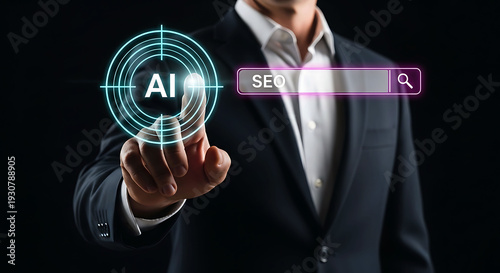 © MdAbul, Fototapeta premium Businessman touching AI target and SEO search bar for digital marketing strategy