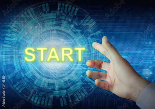 © Naypong Studio, Fototapeta premium Businessman touching start button