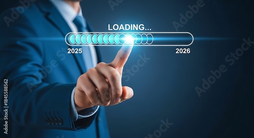 © Ridwan, Fototapeta premium Businessman touching virtual loading bar from 2025 to 2026, symbolizing future progress.