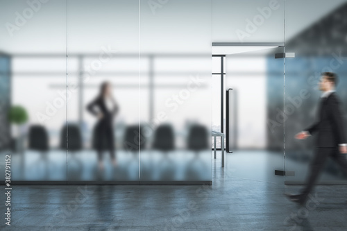 © Who is Danny, Obraz premium Businessman walking in conference interior hall with blurred glass wall.