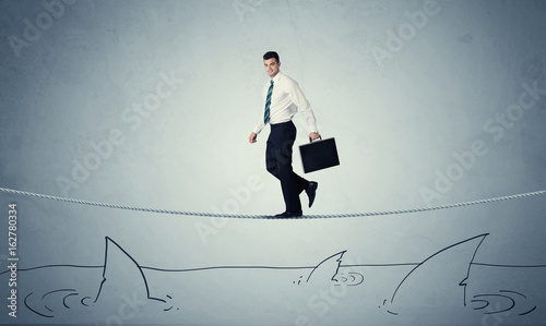 © ra2 studio, Fototapeta premium Businessman walking on rope above sharks