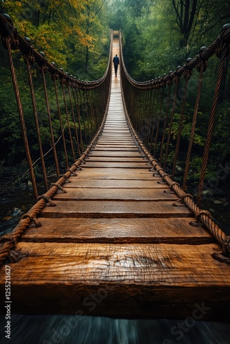 © EdvvinStudios, Obraz premium Businessman walking on rope bridge towards bright future in lush forest