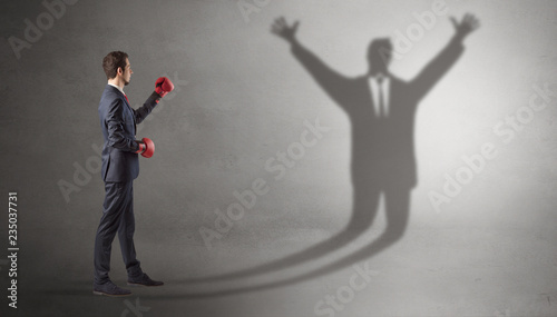 Fototapeta premium Businessman with boxing gloves fighting with disarmed businessman shadow