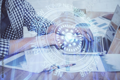 © peshkova, Obraz premium Businessman working on Laptop with technology theme drawing. Concept of big data. Double exposure.