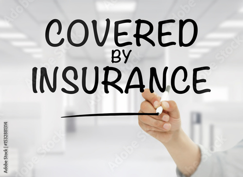 © didem, Fototapeta premium Businessman writing "Covered by insurance" text on transparent wipe board in an office