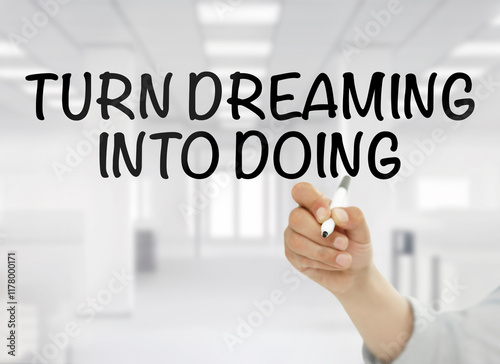 © didem, Naklejka premium Businessman writing "Turn dreaming into doing" text on transparent wipe board in an office