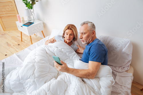 Fototapeta premium Businessmen after seeing disturbing message from daughter
