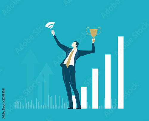 Obraz premium Businessmen making selfie on the phone with trophy. Seccsess and share information