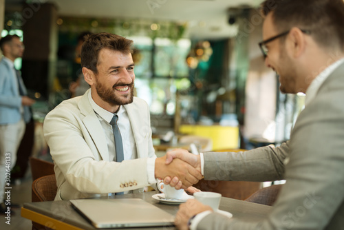 Fototapeta premium Businessmen shaking hands after meeting in a cafe
