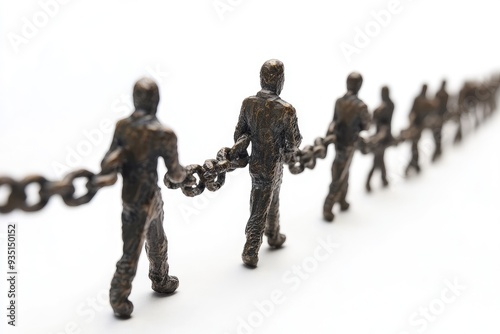 © Gatherina, Naklejka premium Businessmen walking in line holding a chain on white background