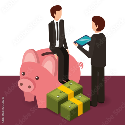 Obraz premium businessmen with tablet piggy bank and banknotes money vector illustration isometric