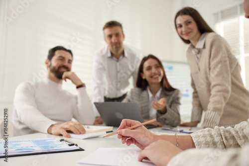 Obraz premium Businesspeople working together at table in office, selective focus
