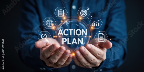 Fototapeta premium Businessperson holds a glowing action plan sphere.