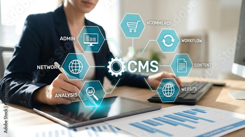 Fototapeta premium Businesswoman analyzing data and interacting with a CMS interface,...