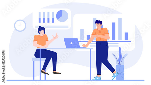 © Hiro, Obraz premium Businesswoman and businessman discussing data presented in graphs at a desk, ideal for corporate presentations and financial reports. Analysis teamwork collaboration.