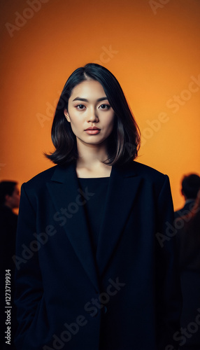 © Evgenii Starkov, Fototapeta premium Businesswoman in a black blazer with dark hair, standing confidently in a warm-toned setting.