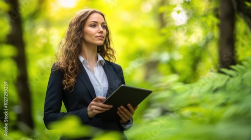 © NOPPHINAN, Obraz premium businesswoman in a suit using a tablet outdoors, surrounded by vibrant green nature, representing the balance between technology and the natural environment