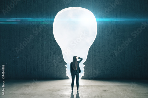 © Who is Danny, Obraz premium Businesswoman in concrete interior with light bulb window and sky view.